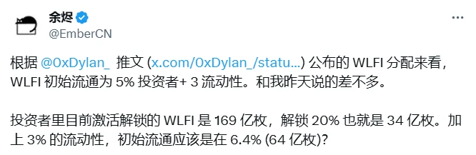 WFLI项目方核心成员Dylan_0x(@0xDylan_)于9月1日通过社交媒体披露代币分配方案:8%分配给Alt5上市公司(锁定状态),10%预留未来激励计划及积分(已锁定待后续披露),团队及机构投资者份额处于锁定状态,3%用于CEX流动性及DEX LP部署,5%分配给投资者群体。该成员在评论区补充说明:"当前流通部分仅限交易所流动性、DEX LP及5%投资人份额。"分析师余烬据此测算指出:"WLFI初始流通量包含5%投资人+3%流动性,其中投资人持有的169亿枚代币已解锁20%(34亿枚),叠加3%流动性份额,实际流通比例或达6.4%(约64亿枚)?"
