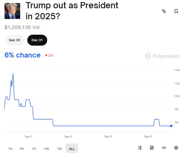 特朗普今年卸任美国总统概率为6% 2025-09-06