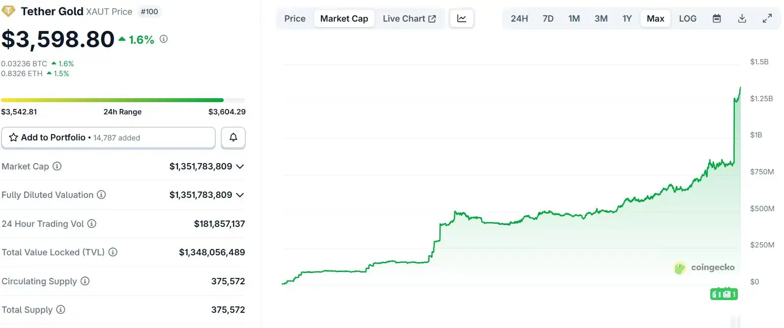 Tether计划向黄金特许权使用费上市公司Elemental Altus追加注资1亿美元,持股比例将增至37.8%,预计交易于四季度完成。此前该公司于6月已收购Elemental Altus约32%股权,旨在整合黄金及比特币等稳定资产至其生态系统。Coingecko数据显示,Tether发行的黄金支持代币XAUT市值达13.5亿美元,当前流通量375,572枚,24小时交易额181,857,137美元。Tether同时披露正与英属维尔京群岛黄金开采投资工具Terranova Resources进行股权谈判,但尚未达成协议,目前持有价值87亿美元的黄金储备。