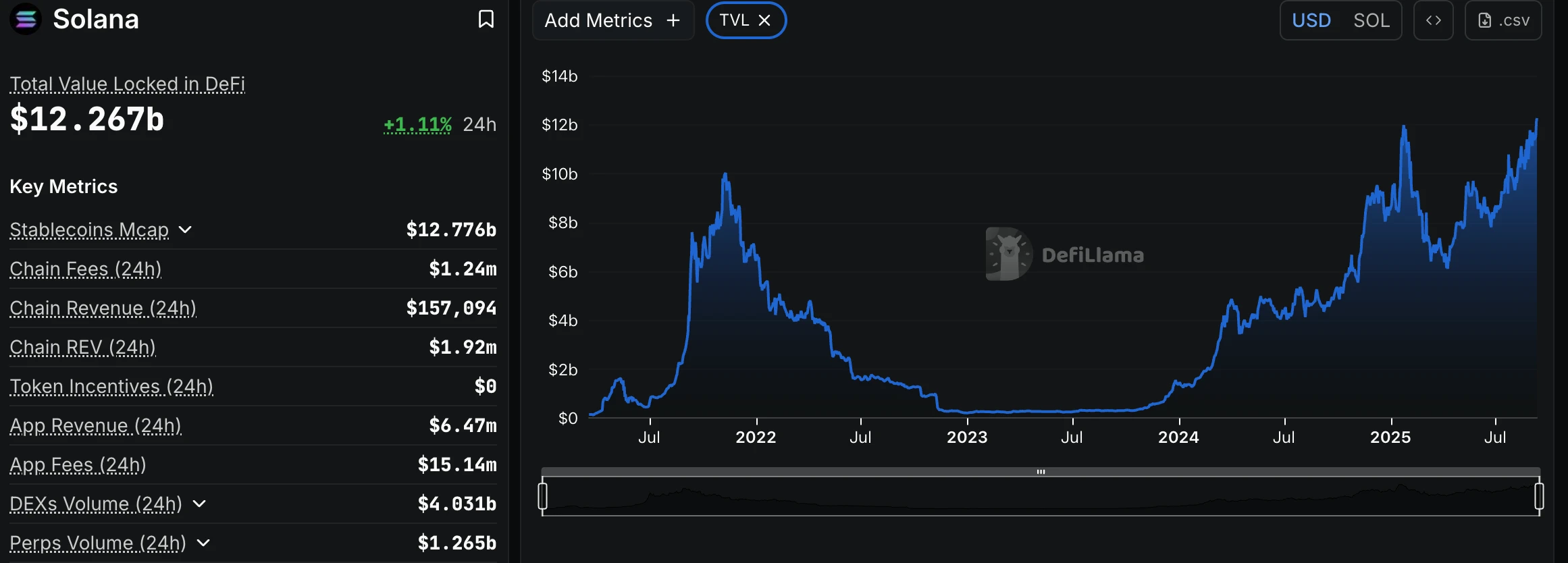 Solana市值达1200亿美元,DeFi总锁仓量突破122.67亿美元 2025-09-10 17:15:32 DeFi快讯 20℃ Solana市值于9月10日达到约1200亿美元,伴随0.94%的24小时涨幅。同时,Solana生态DeFi总锁仓量(TVL)升至122.67亿美元,刷新历史峰值。 上一篇:BTC价格突破112000美元,HTX行情显示24小时跌幅收窄至1% 下一篇:印度拟维持加密货币部分监管框架,担忧系统性风险 相关推荐 以太坊Layer2总锁仓量达363.9亿美元,7日涨幅10.1% 2025-07-13 7月13日,L2BEAT数据显示,以太坊Layer2网络总锁仓量(TVL)升至363.9亿美元,7日涨幅10.1%。各项目锁仓量排名前五分别为:Arbitrum One 155.9亿美元(涨幅10.1%)、Base 133亿美元(涨幅8.11%)、OP Mainnet 12.9亿美元(涨幅7.44% Aptos链上USDT供应量突破10亿美元,稳定币总市值达14.1亿美元 2025-07-20 DeFiLlama数据显示,截至7月20日,Aptos链上USDT供应量突破10亿美元,较一个月前增长20.4%。当前该链上稳定币总市值为14.1亿美元。 微软市值突破4万亿美元,成第二家达成该里程碑企业 2025-07-31 微软市值于7月31日突破4万亿美元关口,当前达4.02万亿美元,成为历史上第二家达成该里程碑的企业。行情数据显示,MSFT开盘价上涨5.5%至540.1美元。 DeFi总锁仓量为何能突破600亿美元?技术瓶颈下如何实现普惠金融? 2025-08-04 文章分析了DeFi市场TVL突破600亿美元后的发展现状,探讨了以MakerDAO为代表的技术创新模式,揭示了以太坊网络拥堵、流动性不足等增长瓶颈,并从普惠金融视角展望了DeFi解决全球17亿无银行账户人群金融包容性的潜力。 JustLendDAO总锁仓量达85.1亿美元,巩固DeFi领先地位 2025-08-12 截至8月12日,官方数据显示,JustLendDAO平台总锁仓量(TVL)达85.1亿美元,用户存款规模超过53.1亿美元,借款量累计至1.96亿美元。作为TRON生态核心金融基础设施,该协议依托创新智能合约架构与严格风控体系,持续提供安全高效的去中心化借贷服务,进一步夯实其DeFi领域领先地位。 JustLend DAO总锁仓量突破81.2亿美元 2025-09-02 数据显示,截至9月2日,JustLend DAO总锁仓量(TVL)突破81.2亿美元,其中存款50.9亿美元,借款1.7507亿美元。作为波场TRON网络的核心DeFi协议,该平台正持续推动去中心化金融生态扩展,提供高效加密资产借贷服务。 Solana市值达1200亿美元,DeFi总锁仓量突破122.67亿美元 2025-09-10 Solana市值于9月10日达到约1200亿美元,伴随0.94%的24小时涨幅。同时,Solana生态DeFi总锁仓量(TVL)升至122.67亿美元,刷新历史峰值。 ASTER合约持仓量激增,市值突破2亿美元 2025-09-20 9月20日,Coinglass数据显示全网ASTER合约持仓量达2.20亿枚,持仓市值突破2亿美元,当前达2.24亿美元,24小时内激增5622.83%。其中币安持仓量6231.91万枚,对应市值6358.41万美元,位居首位;Bybit持仓量3288.13万枚,对应市值3353.89万美元。