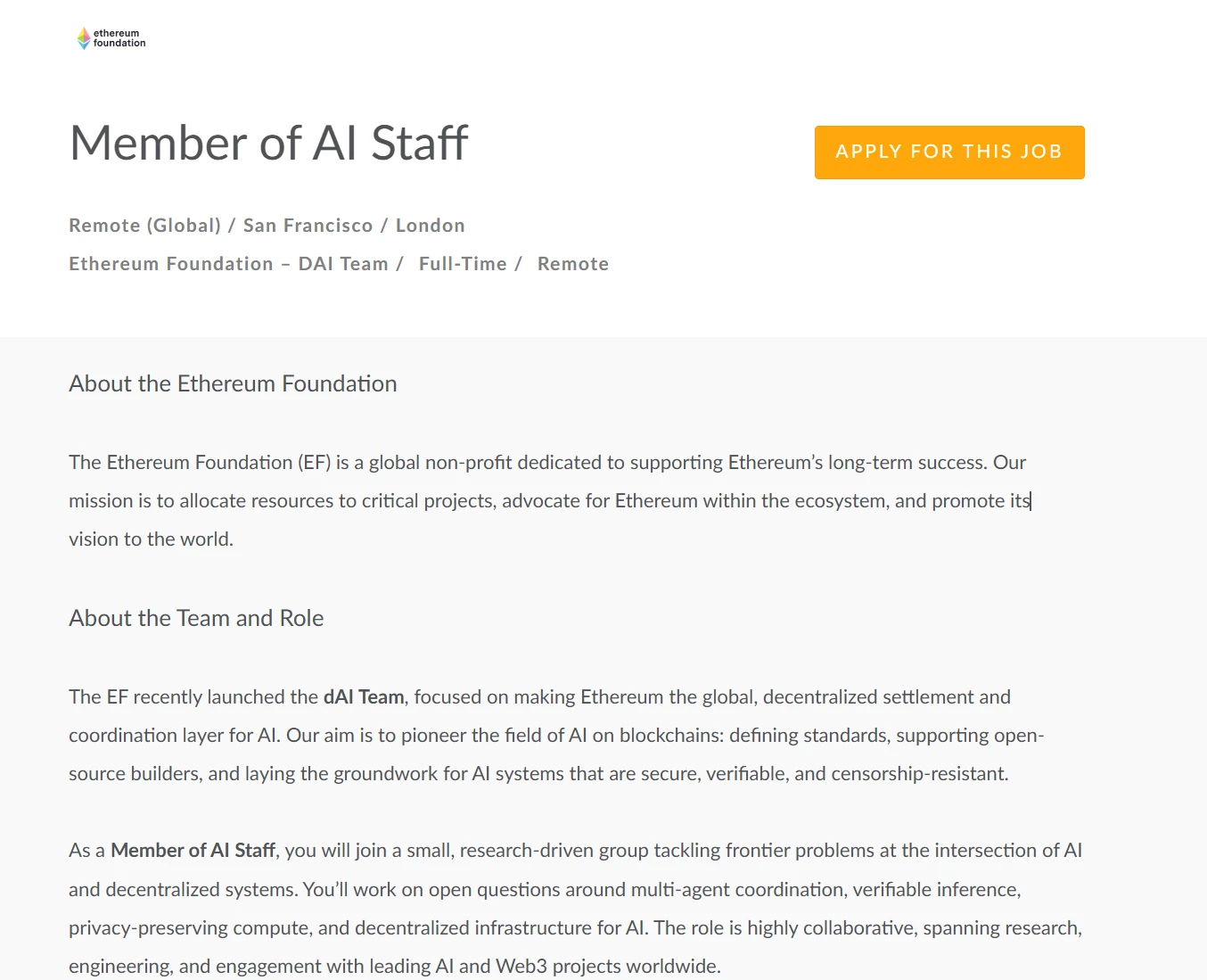 以太坊基金会启动DAI团队招聘,推动区块链与AI融合 2025-09-16 10:59:46 DeFi快讯 56℃ 以太坊基金会于9月16日启动DAI团队关键岗位招聘,开放AI项目经理与AI研究员职位,提供全球远程办公支持,旧金山地区候选人享有优先权。AI项目经理需主导协议改进、生态系统倡议及跨机构协作,聚焦智能体间协议标准化、可验证推理原语定义及L2层与基础设施项目的统筹工作。AI研究员岗位则侧重多智能体协调机制、可验证推理技术及隐私计算等前沿领域研究。该招聘计划延续此前基金会组建DAI团队以推进区块链与AI融合的战略方向。 上一篇:The Fellowship PAC成立并承诺1亿美元支持加密货币友好候选人 下一篇:德林控股收购比特币矿机,股价高开逾6% 相关推荐 以太坊基金会开发团队于7月8日向关联地址转移1000枚ETH 2025-07-08 7月8日,链上分析师PeckShieldAlert监测到以太坊基金会开发团队向关联地址0xc061…0B6d转入1000枚ETH,约合255万美元。该地址当前ETH持仓量为13000枚(约合3300万美元),其中7000枚ETH(约合1756万美元)已转移至Gnosis Safe代理合 Fogo区块链项目宣布成立基金会 或将启动TGE 2025-08-22 L1区块链项目Fogo于8月22日宣布成立基金会,此举可能预示着即将启动代币生成事件(TGE)。 DuckChain与AWS联合举办百万美元黑客松 推动AI与区块链融合 2025-08-25 DuckChain与AWS于8月25日联合启动「DuckChain x AWS Hack: AI Unchained」线上黑客松赛事,活动持续至9月1日,聚焦"AI Agents与去中心化AI基础设施"领域,面向全球AI开发者、Web3构建者及智能体应用团队开放。赛事设立超百万美元奖励池,获Eliz Taiko与K11艺术基金会首尔联办Moon Party 探索区块链与艺术融合 2025-09-02 Taiko与K11艺术基金会联合宣布,将于9月4日在首尔君悦酒店主办“Moon Party”艺术活动。活动将展出中国艺术家黄玉龙的装置艺术,并联合玛莎拉蒂、Hypebeast及Helinox等奢侈与潮流品牌,推动区块链与文化领域的融合。Taiko将运用自主研发的Preconfirmation技术实现 以太坊基金会启动ETH资产转换计划以支持研发及公益项目 2025-09-03 以太坊基金会于9月3日启动ETH资产转换计划,通过中心化交易平台分批小额处置10,000枚ETH以支持研发及公益项目。据链上监测显示,该基金会4小时前已向Kraken交易所转入首笔10,000枚ETH,按当前市价折合约4321万美元。该操作将分多批次执行,单笔交易规模将控制在市场流动性承受范围内。 以太坊基金会隐私团队更名并发布三大技术路线图 2025-09-14 以太坊基金会隐私与扩展探索团队正式更名为Privacy Stewards of Ethereum (PSE),并于9月12日公布核心路线图。该路线图聚焦三大技术方向:隐私写入(使私密链上操作的成本和便利性与公共操作持平)、隐私读取(实现区块链信息读取时的身份与意图保护)、隐私证明(优化证明生成验证速 以太坊基金会成立DAI团队推动链上AI发展 2025-09-15 以太坊基金会将于9月15日成立「DAI」团队,以促进链上AI领域的发展。 以太坊基金会启动DAI团队招聘,推动区块链与AI融合 2025-09-16 以太坊基金会于9月16日启动DAI团队关键岗位招聘,开放AI项目经理与AI研究员职位,提供全球远程办公支持,旧金山地区候选人享有优先权。AI项目经理需主导协议改进、生态系统倡议及跨机构协作,聚焦智能体间协议标准化、可验证推理原语定义及L2层与基础设施项目的统筹工作。AI研究员岗位则侧重多智能体协调机
