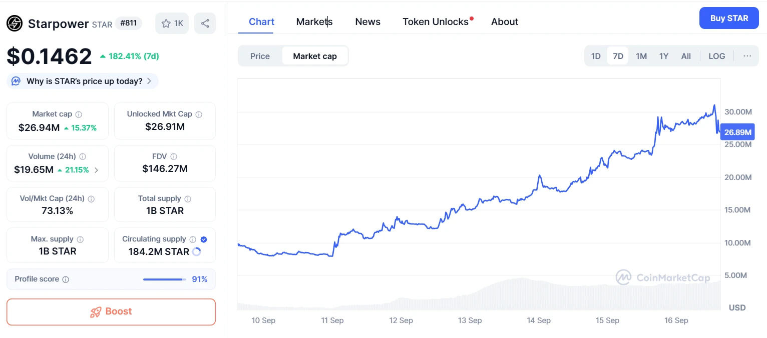 Starpower(STAR)代币价格飙升,7日涨幅达182.23% 2025-09-16 16:24:44 DeFi快讯 42℃ Starpower(STAR)代币价格于9月16日报0.1458美元,市值现为2688万美元,近7日涨幅达182.23%,盘中市值曾触及3100万美元高点。 上一篇:某未知钱包向Coinbase Institutional转入432枚BTC,价值约5003.8万美元 下一篇:黄立成PUMP 5x多单重返浮盈,持仓数据及交易动态解析 相关推荐 BERA代币在HTX交易所价格突破2.5美元 日内涨幅达19.02% 2025-07-16 BERA代币在HTX交易所7月16日报出2.4929美元最新成交价,日内涨幅达19.02%。该代币当日短时价格曾触及2.5美元高位。 BNB代币价格创新高,单日涨幅达3.35% 2025-08-14 BNB于8月14日创历史新高,币安数据显示该代币短时触及865.68美元后回落至862.3美元,24小时涨幅达3.35%。 MNT代币14日累计涨幅达98% 2025-08-17 Bybit数据显示,MNT代币8月17日报价1.35美元,24小时涨幅达10%,14日累计涨幅98%。 OKB代币价格创新高,单日涨幅超32% 2025-08-21 8月21日,OKB代币在OKX平台行情数据中攀升至190美元历史峰值,当前报185.85美元,单日涨幅达32.06%。 OKB代币价格创新高,单日涨幅达53.7% 2025-08-21 根据OKX数据,OKB代币于8月21日创下历史新高,价格达到206美元,较此前突破200美元的水平上涨53.7%。 BGB代币价格单日飙升16% 受销毁事件影响 2025-09-02 BGB 24小时涨幅达16%,截至9月2日当前价格为5.29美元,可能受代币销毁事件影响。 Starpower(STAR)代币价格飙升,7日涨幅达182.23% 2025-09-16 Starpower(STAR)代币价格于9月16日报0.1458美元,市值现为2688万美元,近7日涨幅达182.23%,盘中市值曾触及3100万美元高点。 BNB价格创新高,日内涨幅达3.57% 2025-09-18 币安数据显示,BNB于9月18日早间创下995.44美元的历史新高,目前价格为990.00美元,日内涨幅达3.57%。